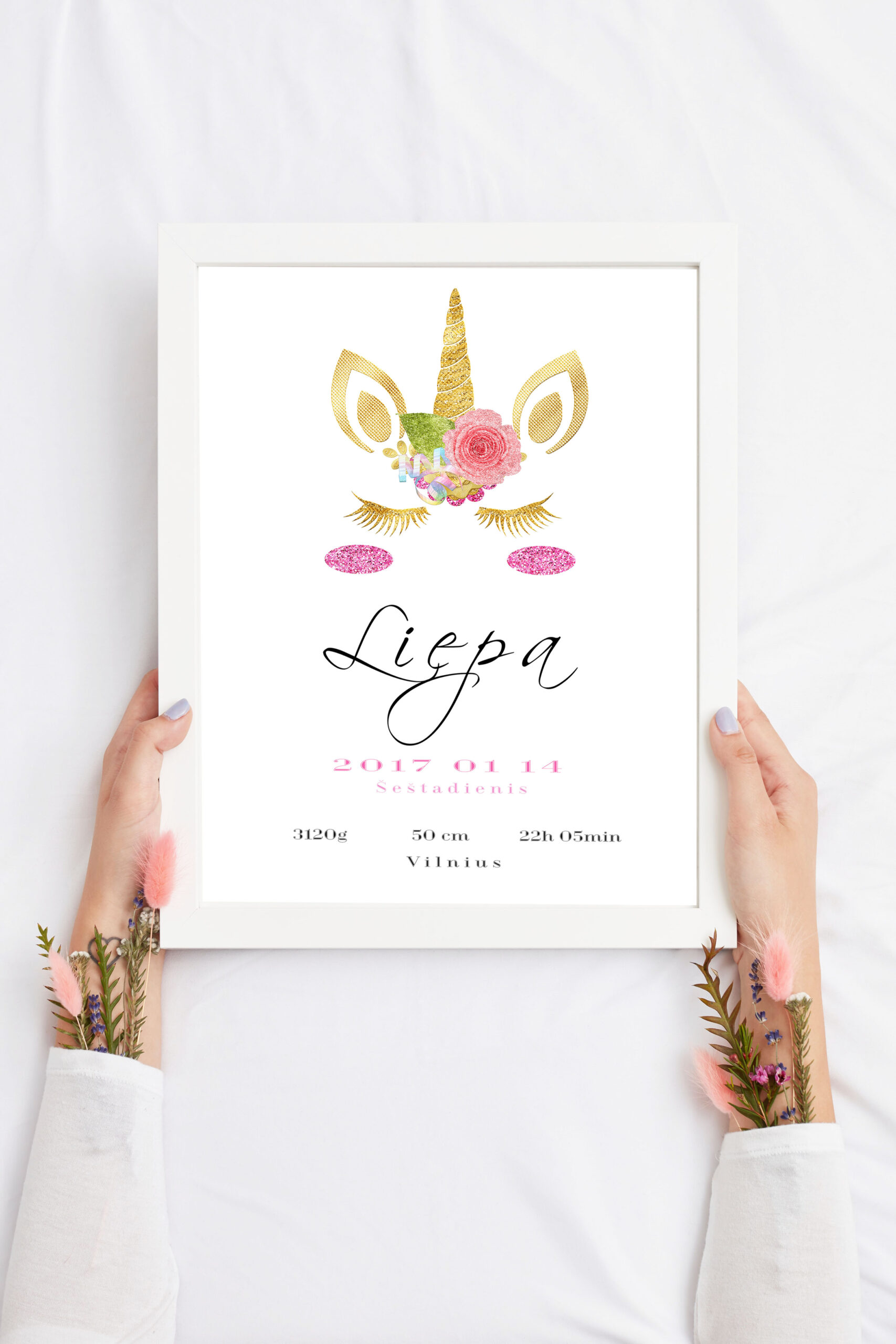 Personifikuotas rėmelis sukuriamas pagal jūsų pateiktus duomenis (vaiko vardas, gimimo data, laikas ir pan.)