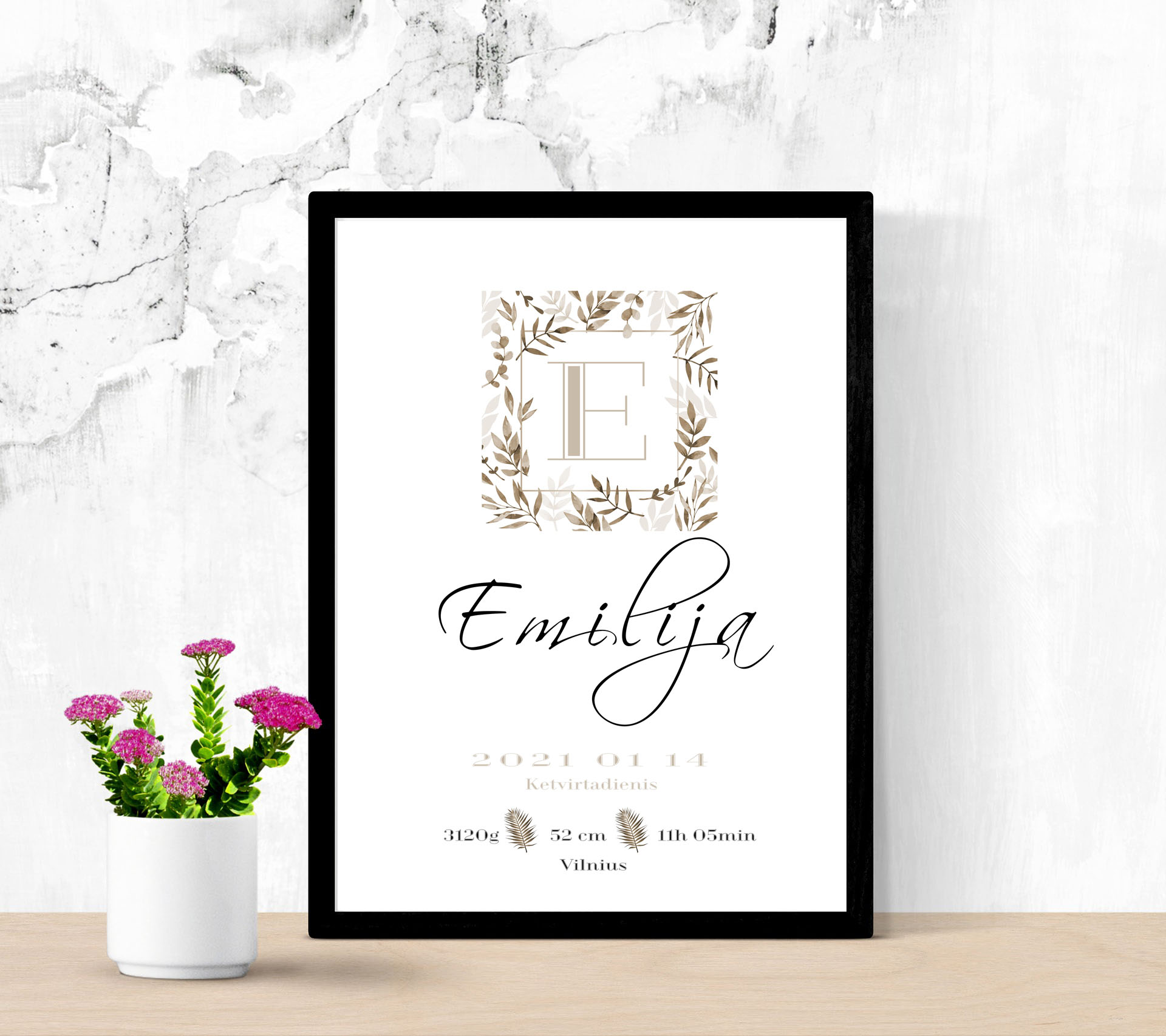 Personifikuotas rėmelis sukuriamas pagal jūsų pateiktus duomenis (vaiko vardas, gimimo data, laikas ir pan.)